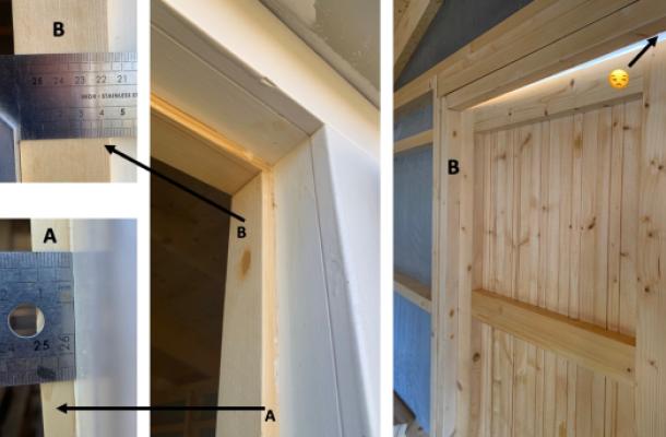 Here is the thing: the door of the cabine doesn't close completely because there is not enough clearance between the door and the door frame (surface 'A' in the photo). My idea to solve it is to trim a little surface 'A' using a router, but I am not sure from which direction to do it and with which type of router bit. Is this a good approach? Any suggestion will be highly appreciated!